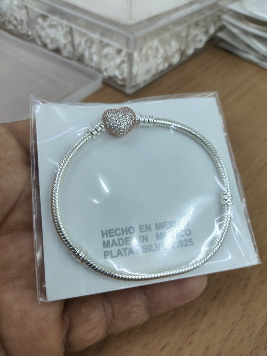 TMPPD007-18 Pulsera Dama Pand Corazón Plata Rosa Pavé 18 cm en Plata Fina .925