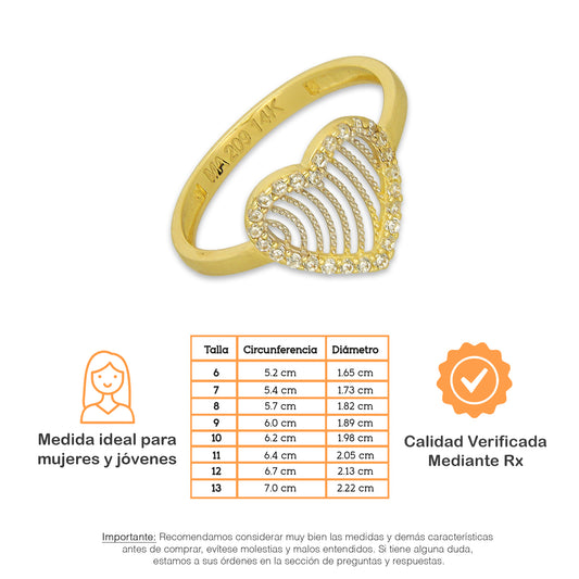 MR14AD041 Anillo Dama Oro Sólido 14K Modelo Corazón Ondas Filigrana con Zirconias