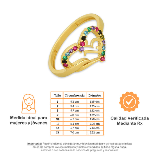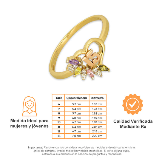 MR14AD050 Anillo Dama Oro Sólido 14K Modelo XV Años Corazón Multicolor