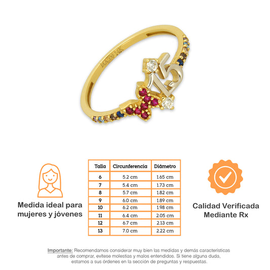 MR14AD051 Anillo Dama Oro Sólido 14K Modelo XV Años Tira Multicolor