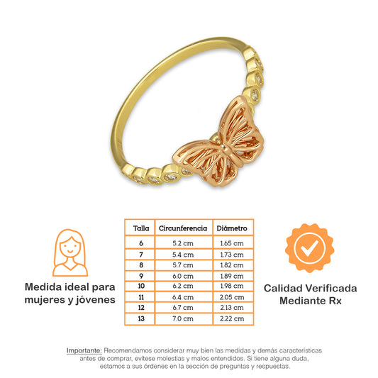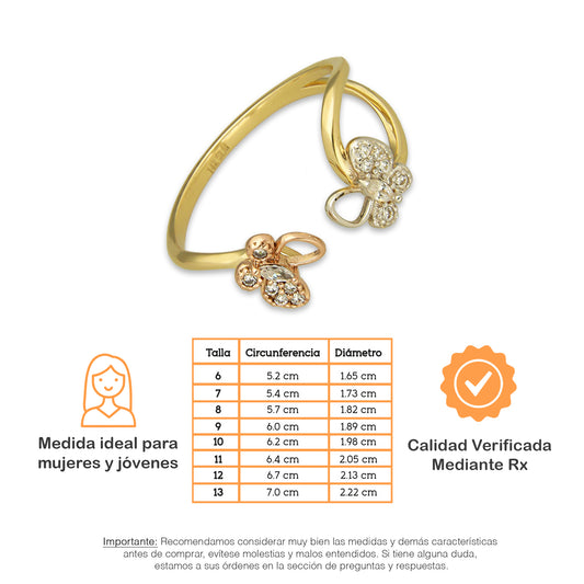 MR14AD032 Anillo Dama Oro Sólido 14K Modelo 2 Mariposas Rosa y Amarilla con Zirconias