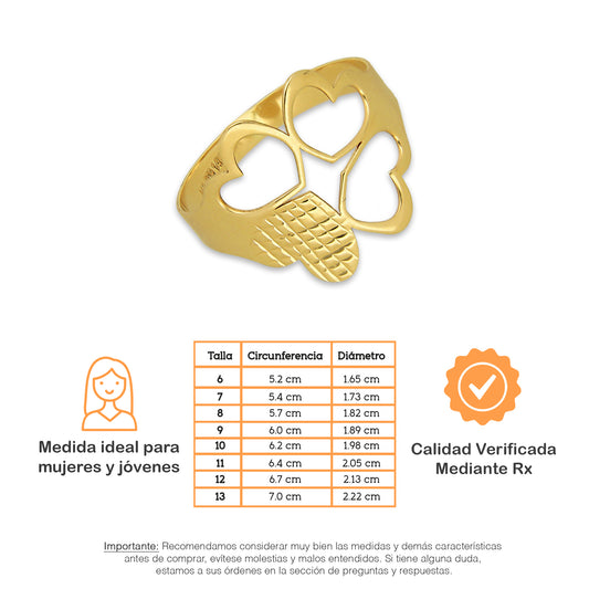 MR14AD040 Anillo Dama Oro Sólido 14K Modelo Trébol 4 Corazones 3 Calados 1 Diamantado