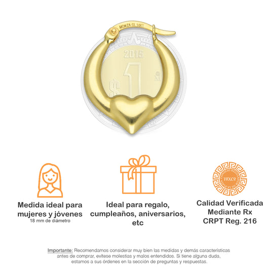 MR14AR007 Arete Arracada Oro Sólido 14K Modelo Bombeada Heart 1.8 cm