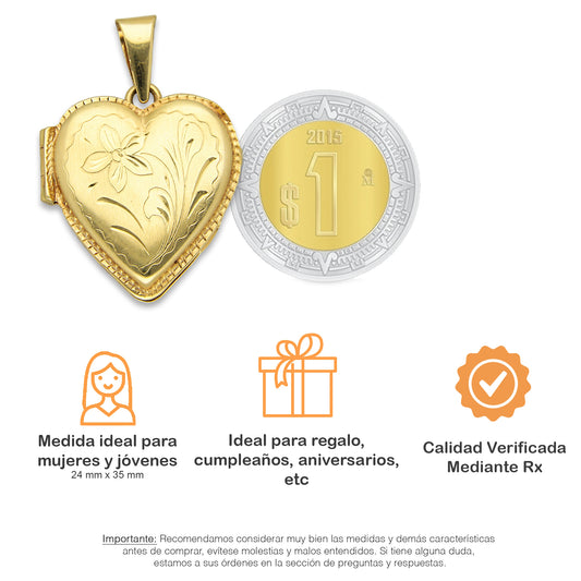 MR14DJ067 Dije Oro Sólido 14K Corazón Portaretratos Bombeado Liso 2.4 cm x 3.5 cm