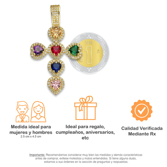 MR14DJ075 Dije Oro Sólido 14K EM14 Crucifijo Corazones Multicolor 2.5 cm x 4.5 cm