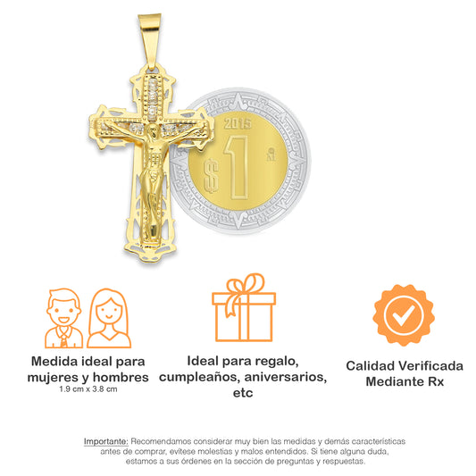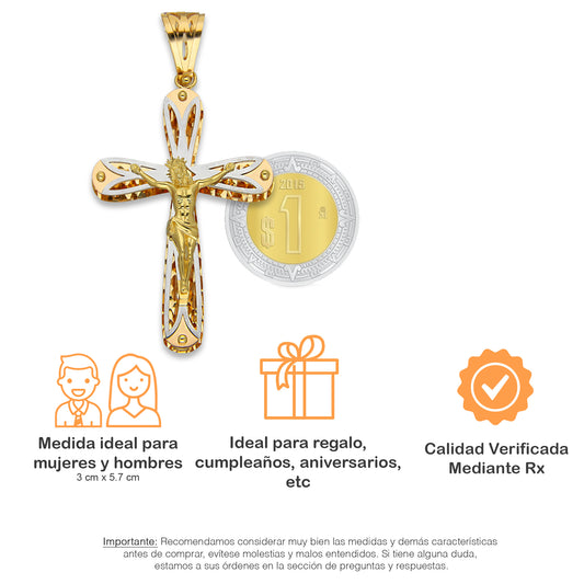 MR14DJ080 Dije Oro Sólido 14K EM14 Crucifijo Filigrana Tamaño 2 1.9 cm x 3.8 cm