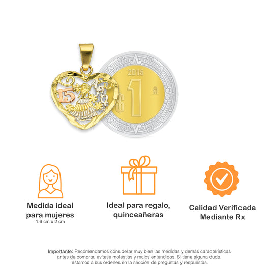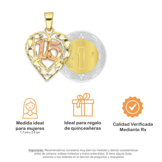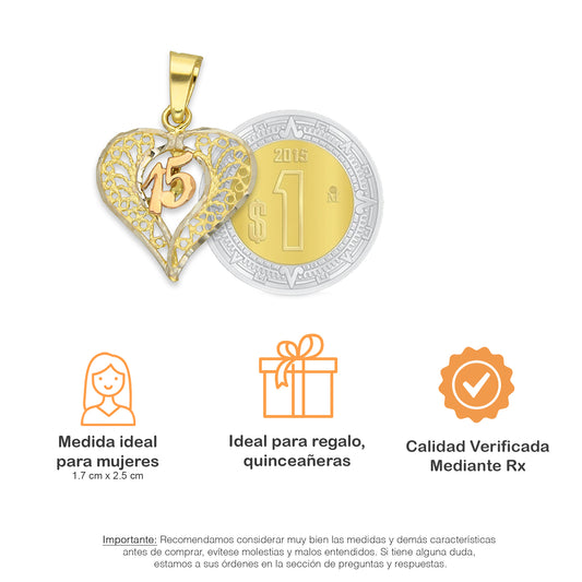 MR14DJ086 Dije Oro Sólido 14K Corazón Filigrana 15 Años 1.7 cm x 2.5 cm