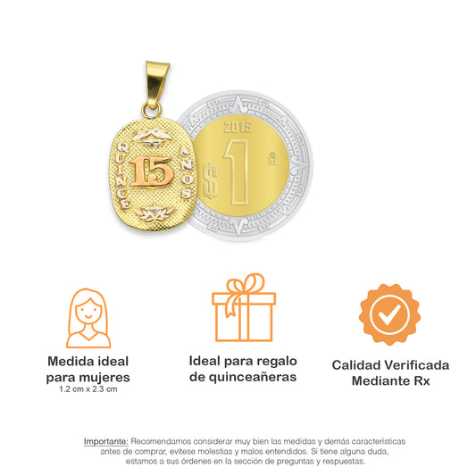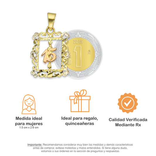 MR14DJ085 Dije Oro Sólido 14K Rectángulo Ornamentado 15 Años 1.5 cm x 2.6 cm