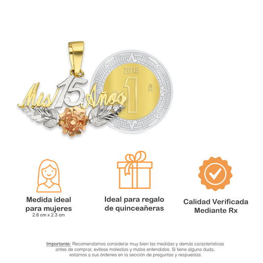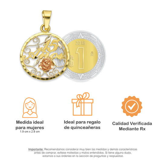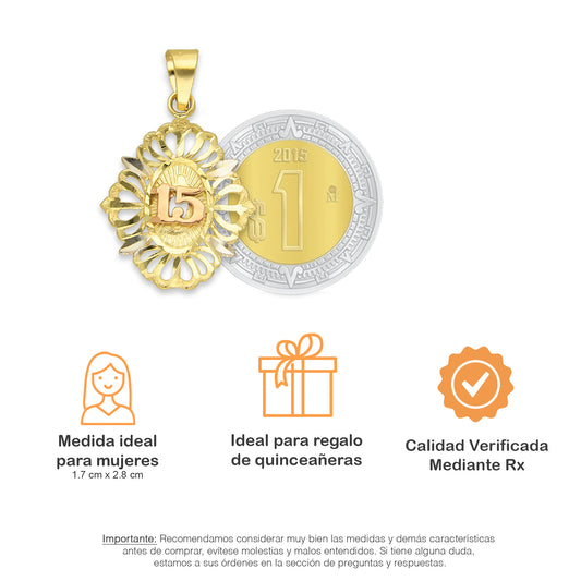 MR14DJ091 Dije Oro Sólido 14K Circulo Xv Años con Flor 1.9 cm x 2.8 cm