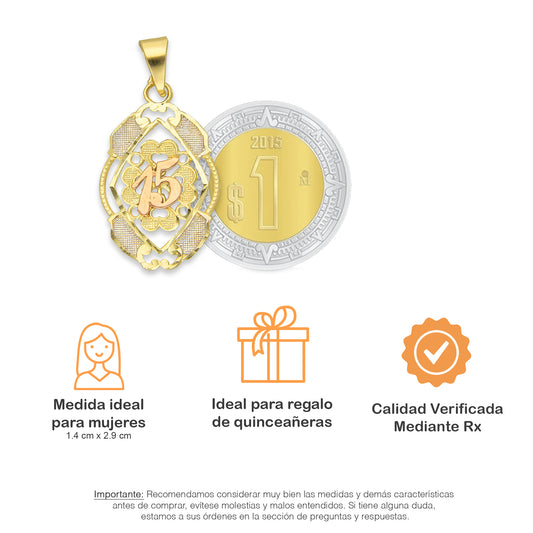MR14DJ088 Dije Oro Sólido 14K Óvalo Olan 15 Años 1.7 cm x 2.8 cm
