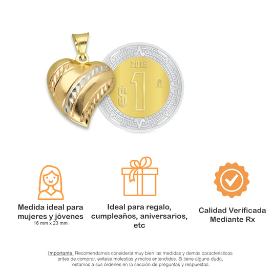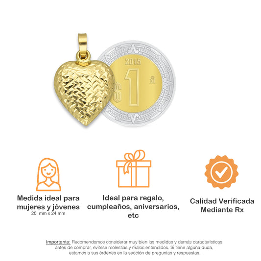 MR14DJ059 Dije Oro Sólido 14K Corazón Bombeado Florentino Diamantado 1.6 cm x 2.3 cm