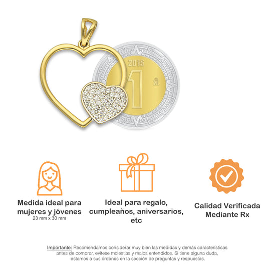 MR14DJ064 Dije Oro Sólido 14K Corazón Liso con Corazón Pequeño Pavé 2.2 cm x 2.7 cm