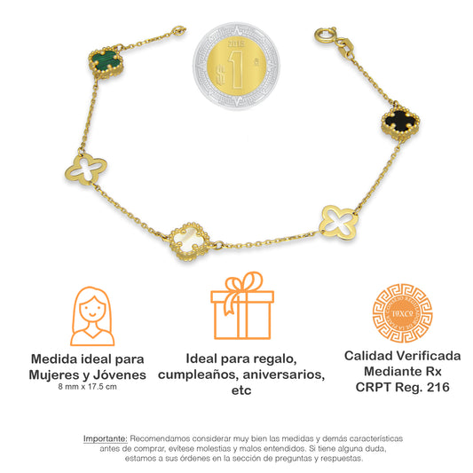 MR14PD055 Pulsera Dama Oro Sólido 14K Mod Trébol Negro, Blanco y Verde con Dije Liso 8 mm x 17.5 cm