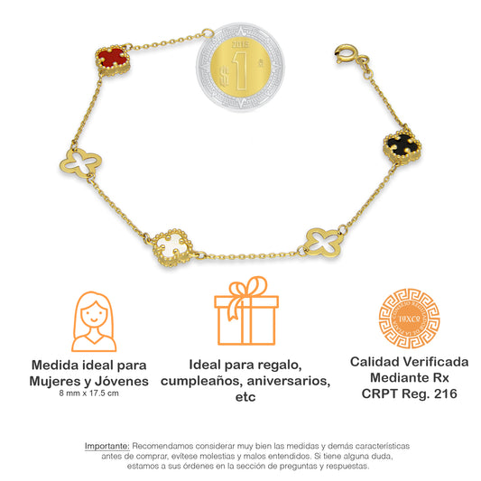 MR14PD056 Pulsera Dama Oro Sólido 14K Mod Trébol Negro, Blanco y Rojo con Dije Liso 8 mm x 17.5 cm
