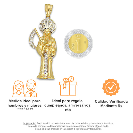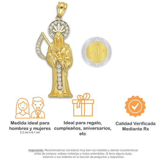 MR14DP099 Cadena Caballero Oro Sólido 10K + Dije Oro Sólido 14K EM Santa Muerte con Zirconia 2.2 cm x 6.1 cm