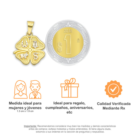 MR14DP021 Cadena Oro Sólido 10K + Dije Oro Sólido 14K Trébol 4 Hojas Troquelado Diamantado Florentino 1.3 cm x 2.2 cm