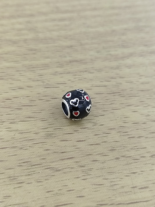 TMPCH033 Dije Charm Pand Bola de Fuego Esmalte Negro con Corazones en Plata Fina .925