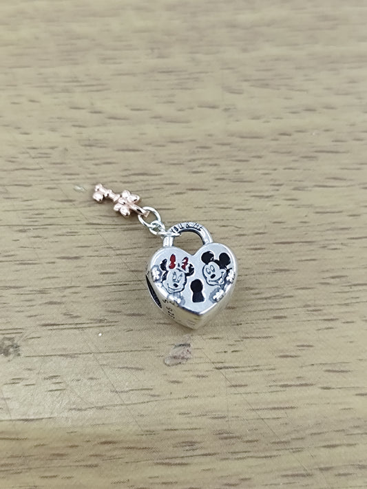 TMPCH027 Dije Charm Pand Corazón con Llave Minnie y Mickey en Plata Fina .925
