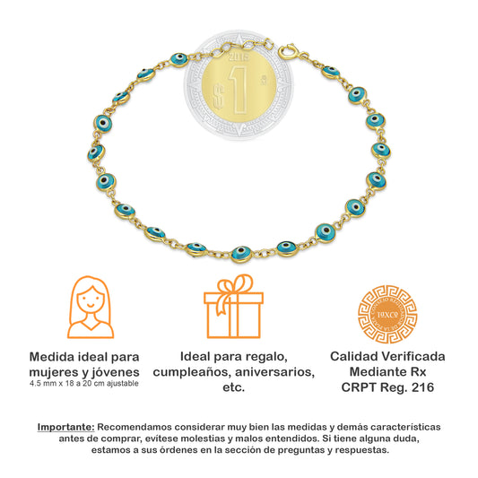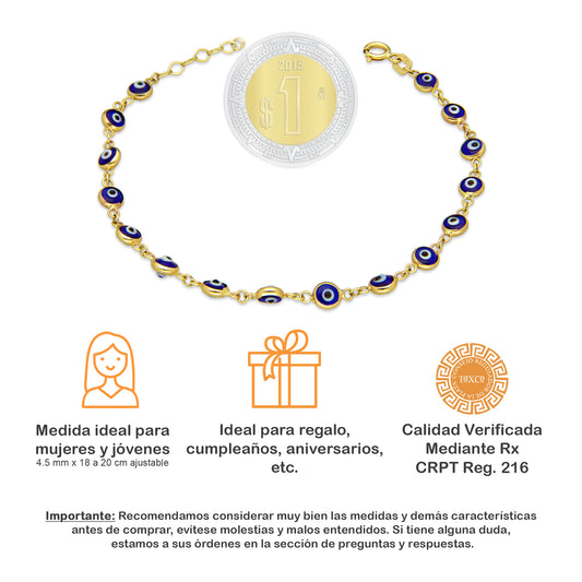 MR10PD027 Pulsera Dama Oro Sólido 10K EMF10 Modelo Ojitos Turcos Azul con Bisel 4.5 mm Ajustable 18 a 20 cmPrecio habitual $ 4,540.54 MXNPrecio habitualPrecio unitario / por-
