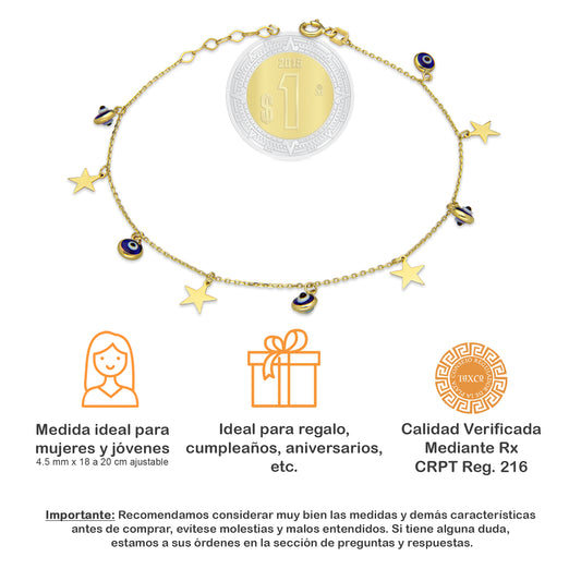MR10PD033 Pulsera Dama Oro Sólido 10K EMF10 Modelo Ojitos Turcos Azul Marino y Estrellas Colgantes 4.5 mm Ajustable 18 a 20 cmPrecio habitual $ 2,663.78 MXNPrecio habitualPrecio unitario / por-