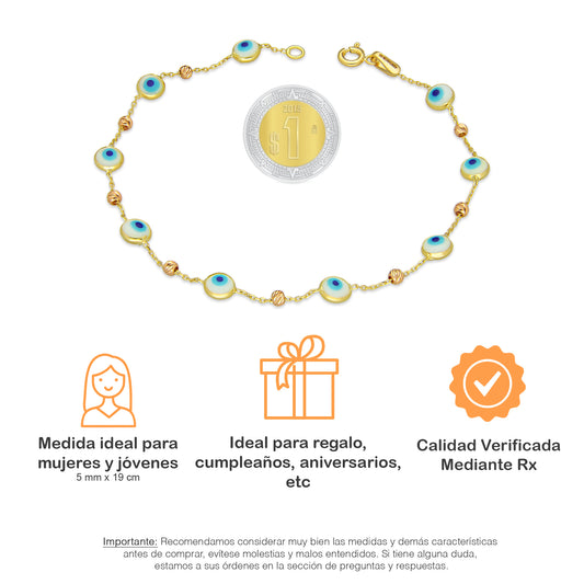 MR10PD030 Pulsera Dama Oro Sólido 10K EMF10 Modelo Ojitos Turcos Multicolor con Bisel 4.5 mm Ajustable 18 a 20 cm