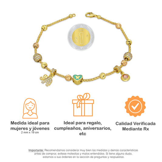 MR14PD144 Pulsera Dama Oro Sólido 14K EMF14 Modelo Bolitas Diamantadas y Dije Colgante de Elefante 2 mm x 19 cm