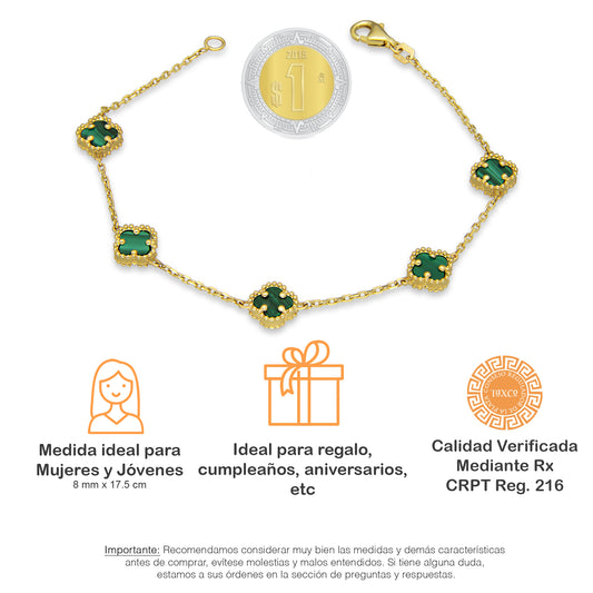 MR14PD057 Pulsera Dama Oro Sólido 14K Mod Trébol Verde 8 mm x 17.5 cm
