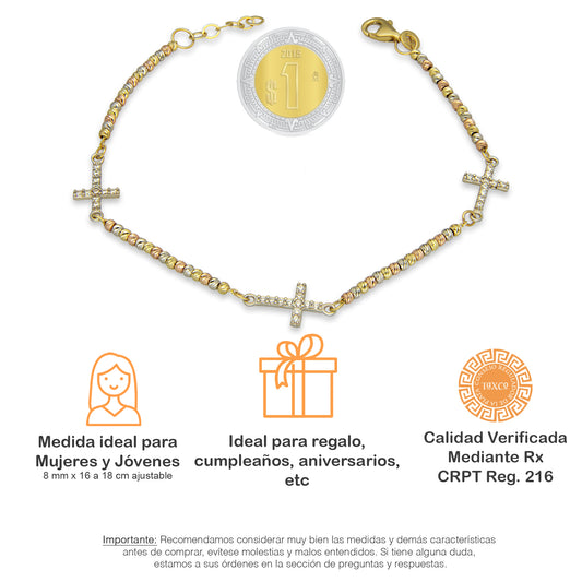 MR14PD058 Pulsera Dama Oro Sólido 14K Mod Bolitas Diamantadas Florentino con Cruces Ancho 8 mm Ajustable de 16 a 18 cm