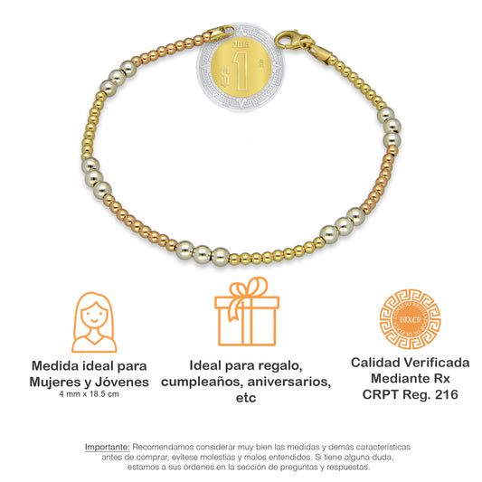 MR14PD060 Pulsera Dama Oro Sólido 14K Mod Bolitas Lisas 3 Oros 4 mm x 18.5 cm