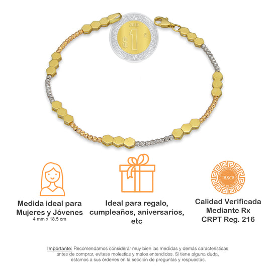 MR14PD061 Pulsera Dama Oro Sólido 14K Mod Bolitas Diamantadas con Hexágonos Lisos 4 mm x 18.5 cm
