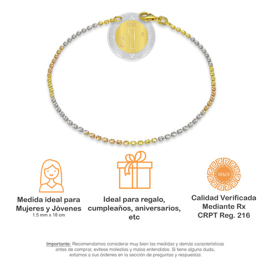 MR14TB004 Pulsera Tobillera Dama Oro Sólido 14K Mod Torsal con Bolitas Facetadas 3 mm Ajustable de 23 a 25 cm