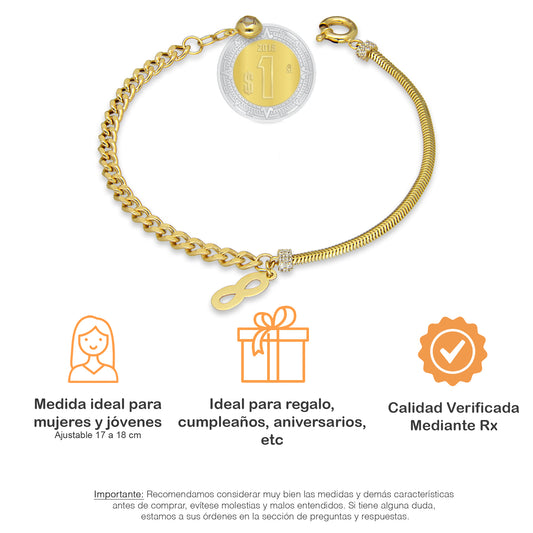 MR14PD066 Pulsera Dama Oro Sólido 14K Mod Mixta Panza de Víbora y Barbada con Infinito Ajustable 17 a 18 cm