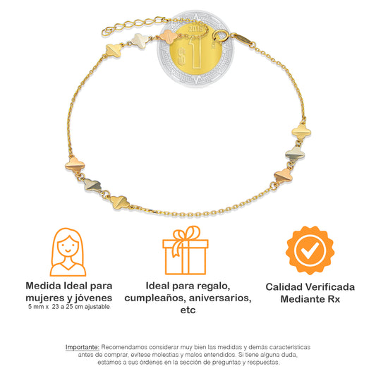 MR14TB001 Pulsera Tobillera Dama Oro Sólido 14K Mod Triada Trébol Florentino 5 mm Ajustable de 23 a 25 cm
