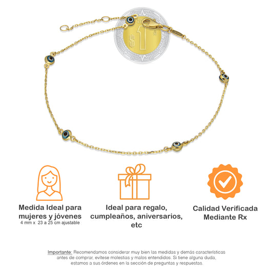 MR14TB002 Pulsera Tobillera Dama Oro Sólido 14K Mod Ojitos Turcos Con Bisel 4 mm Ajustable de 23 a 25 cm