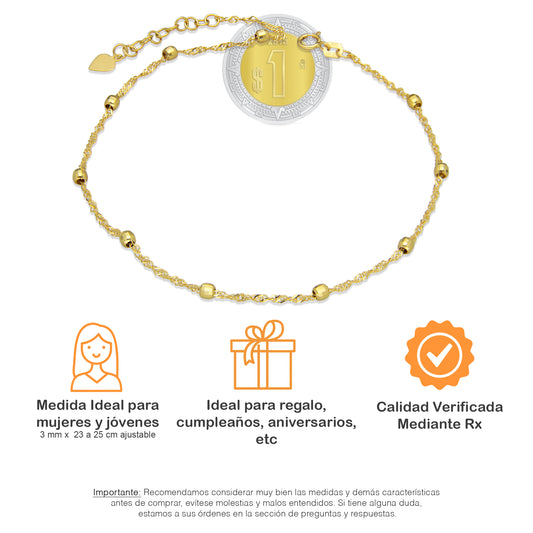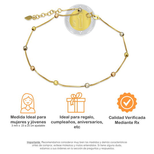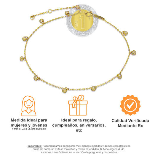 MR14TB004 Pulsera Tobillera Dama Oro Sólido 14K Mod Torsal con Bolitas Facetadas 3 mm Ajustable de 23 a 25 cm