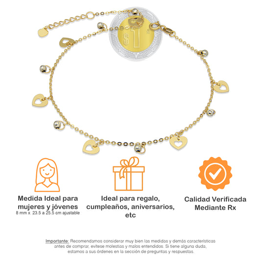 MR14TB006 Pulsera Tobillera Dama Oro Sólido 14K Mod Corazones Calados Colgantes y Bolitas 8 mm Ajustable de 23.5 a 25.5 cm