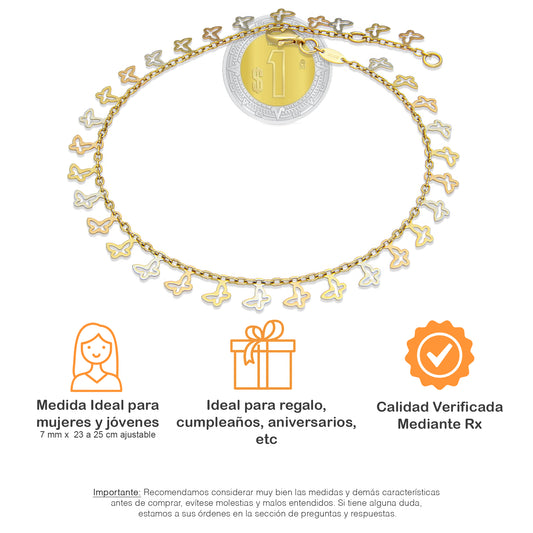 MR14TB010 Pulsera Tobillera Dama Oro Sólido 14K Mod Mariposas Colgantes 7 mm Ajustable de 23 a 25 cm