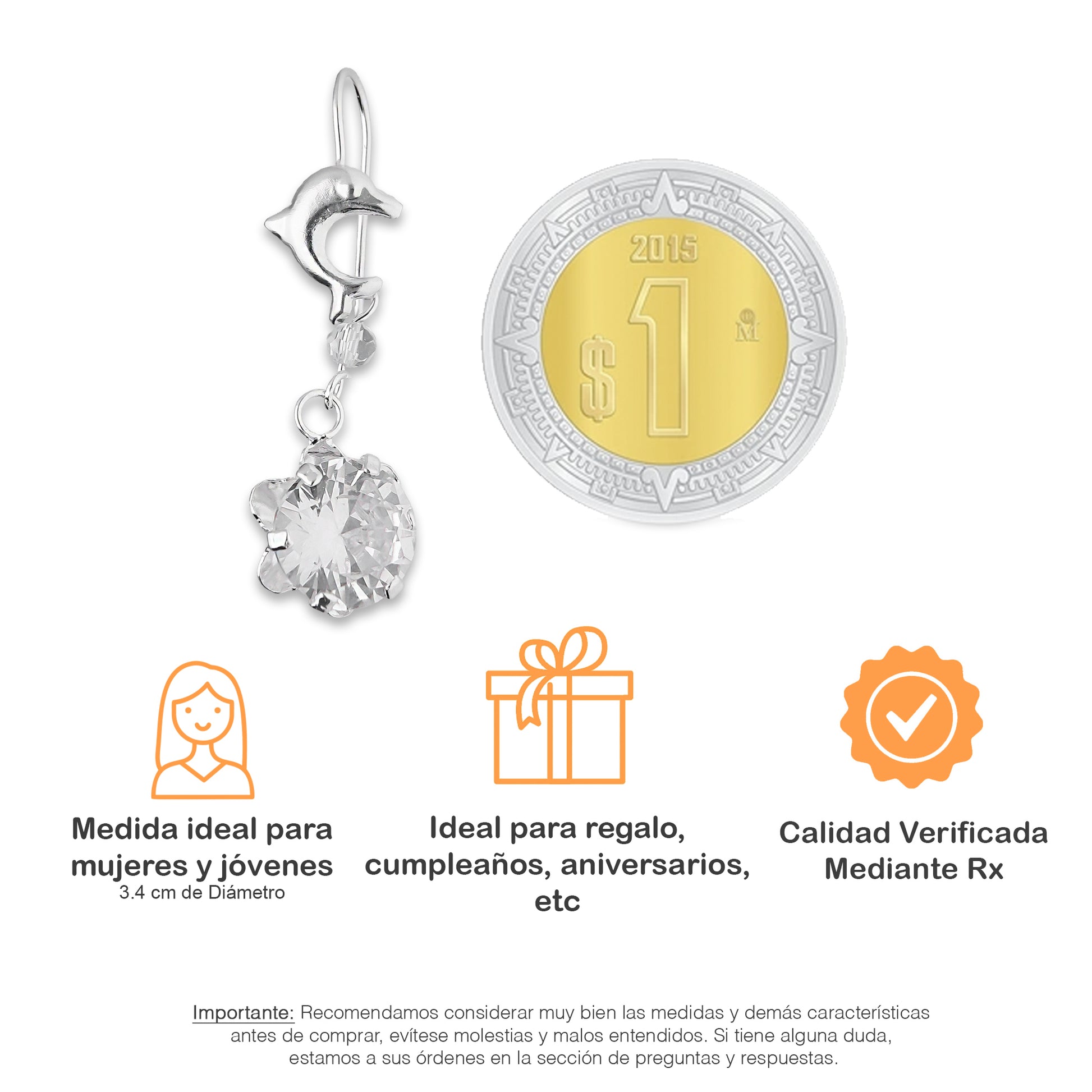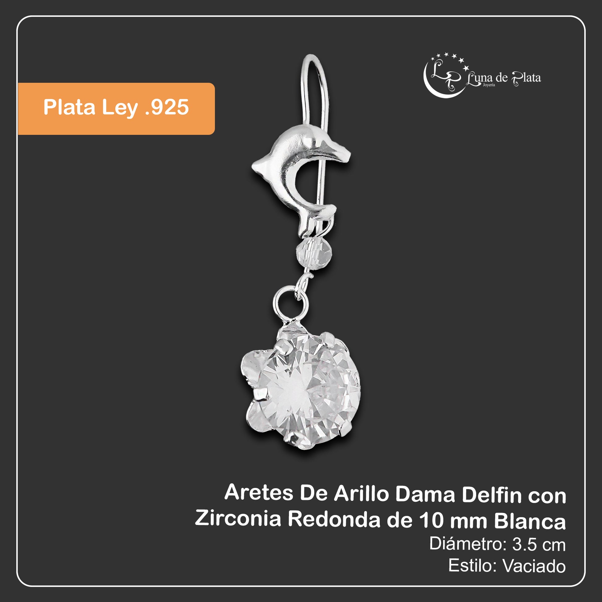 LPAA022 Aretes De Arillo Dama Delfin con Zirconia Redonda de 10 mm Blanca en Plata .925 MLM2855914531