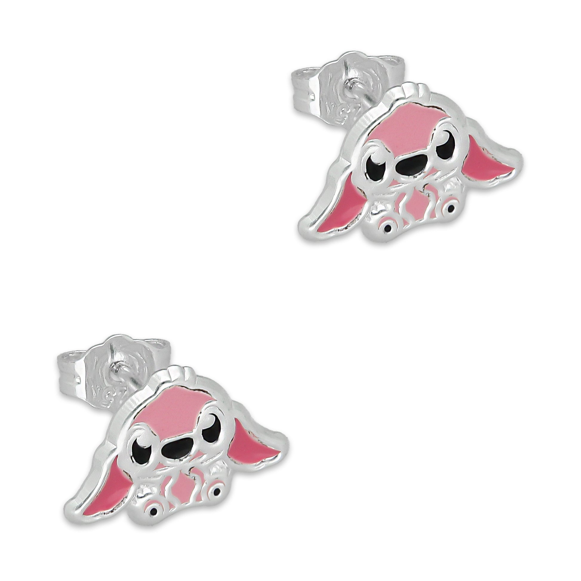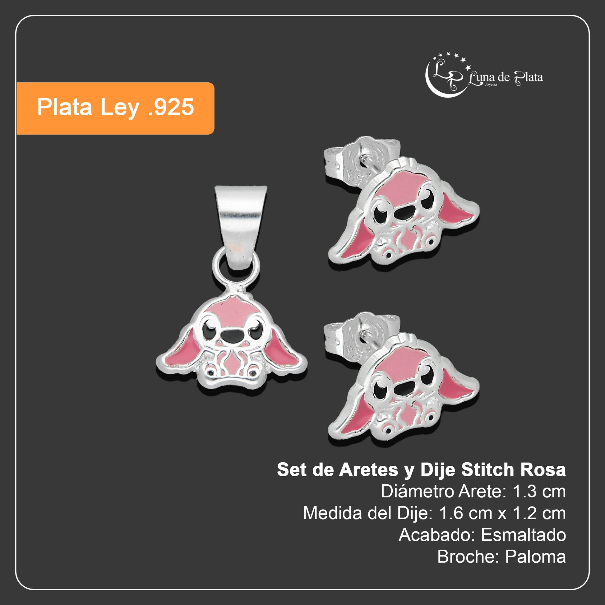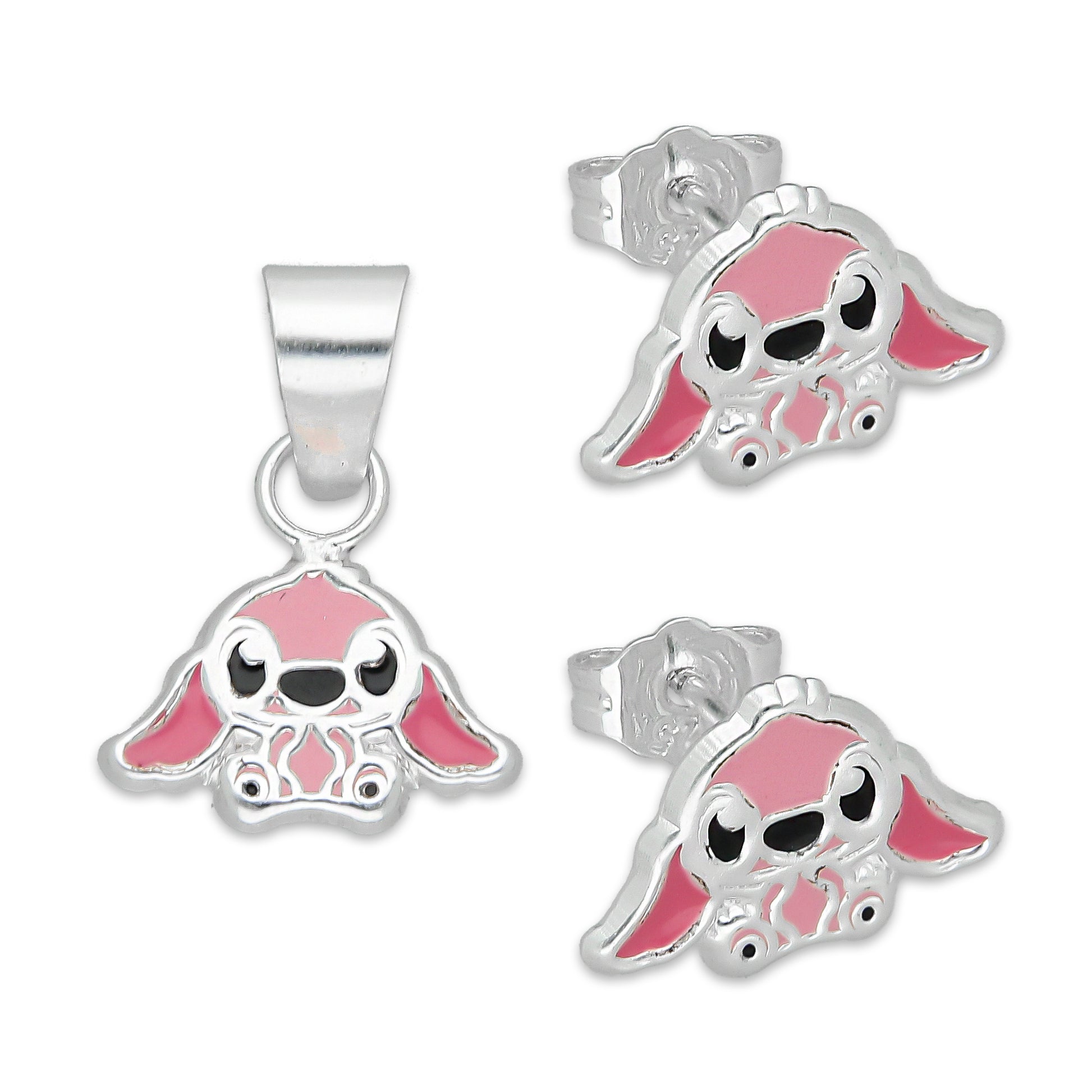 LPADJ072 Set de Aretes y Dije Stitch Rosa Diámetro 1.6 cm en Plata Ley .925