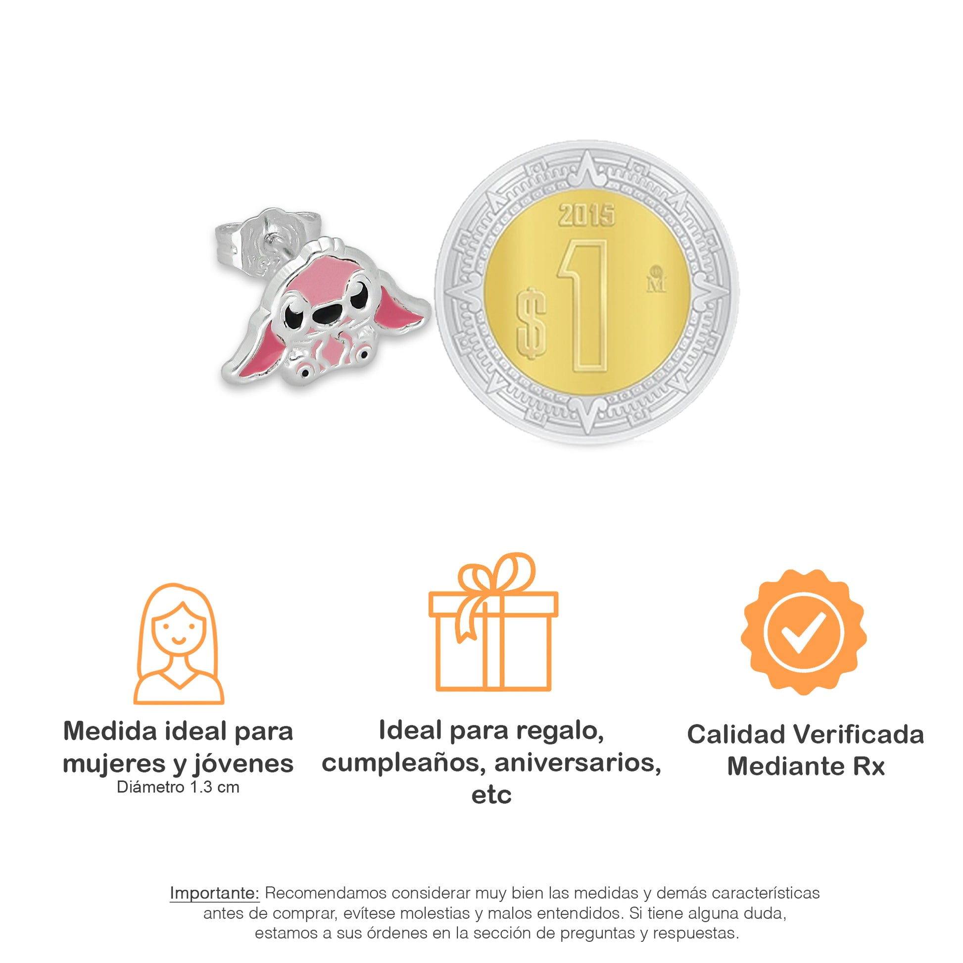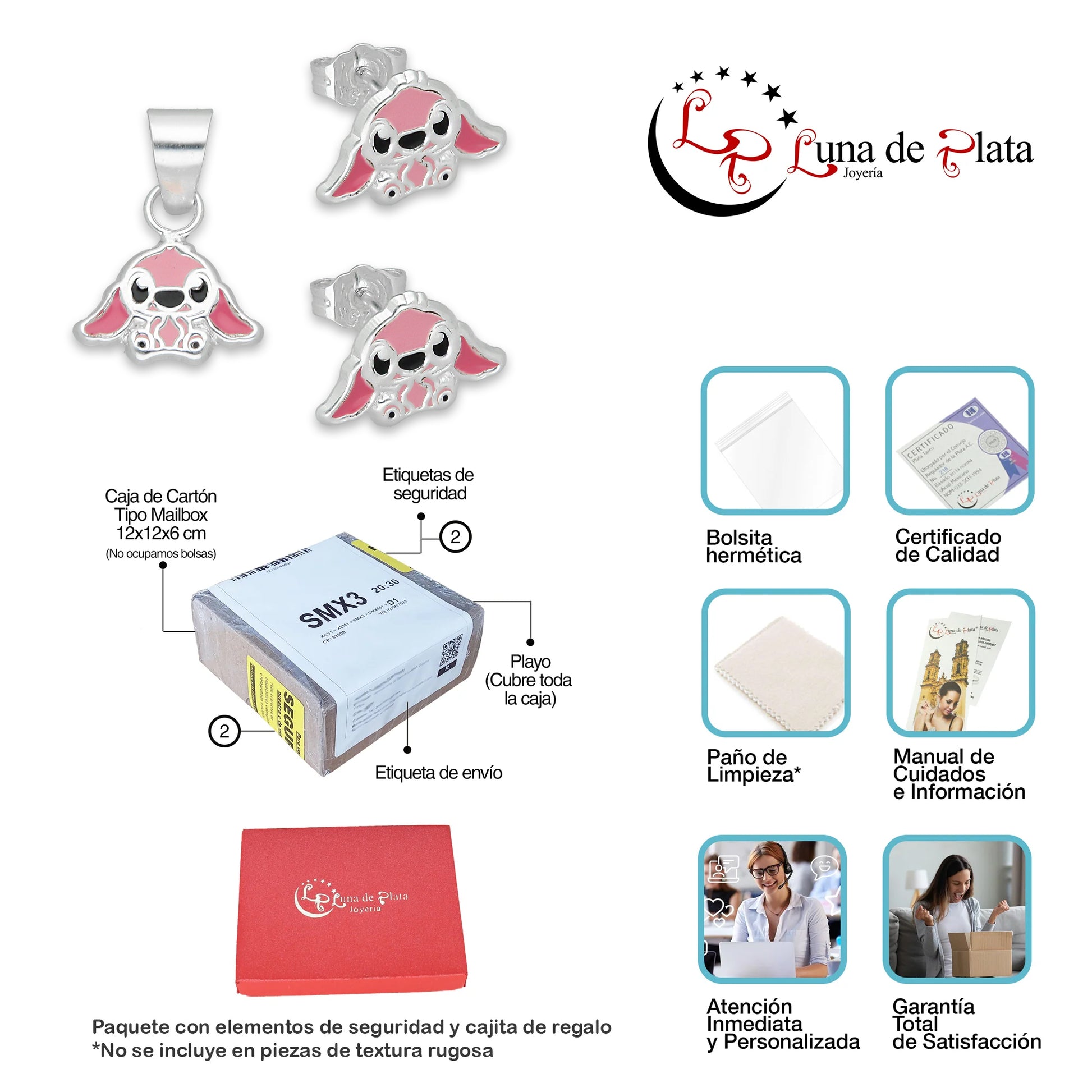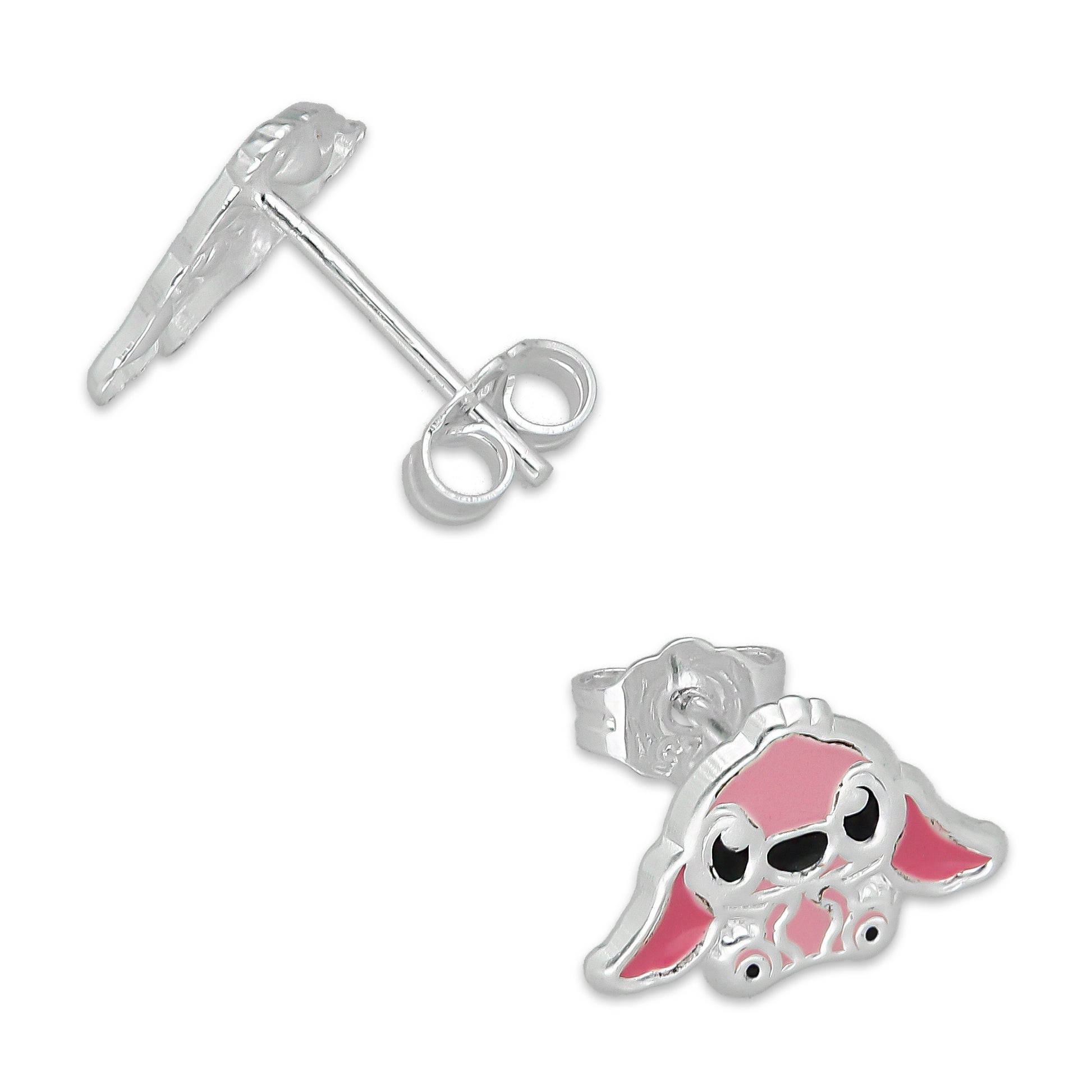 LPADJ072 Set de Aretes y Dije Stitch Rosa Diámetro 1.6 cm en Plata Ley .925