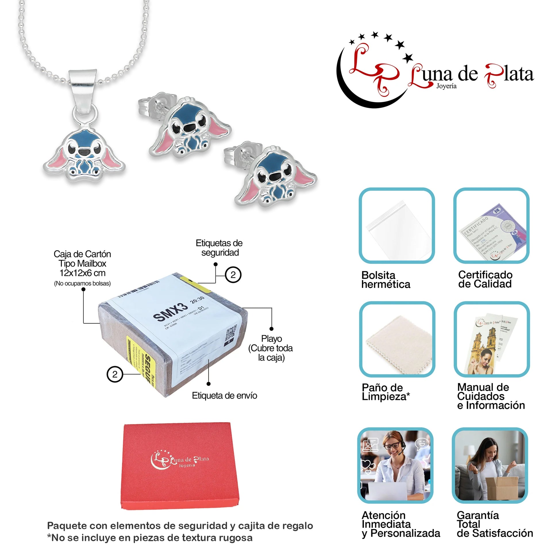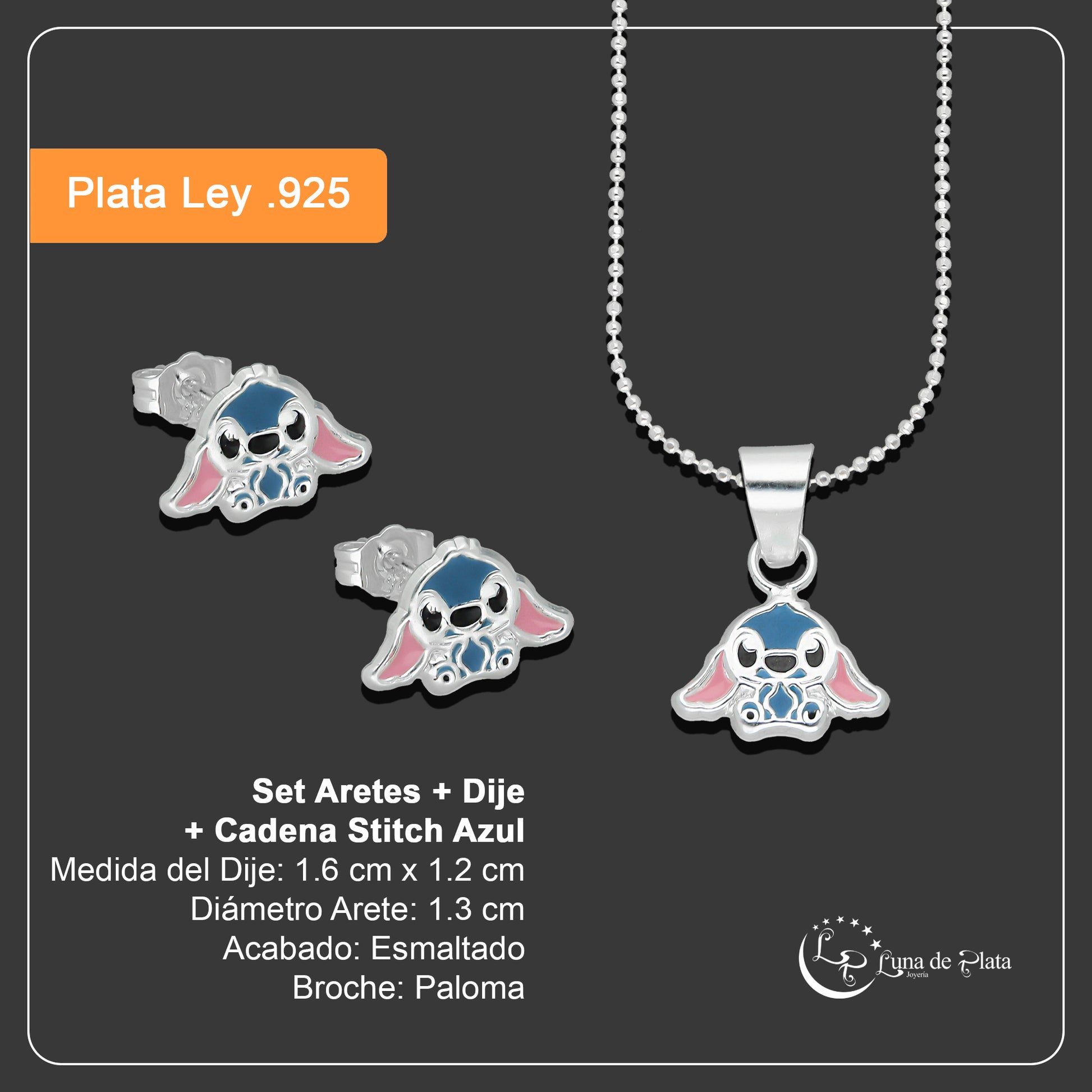 LPADJ073 Set Aretes + Dije + Cadena Stitch Azul Diámetro 1.6 cm en Plata Ley .925
