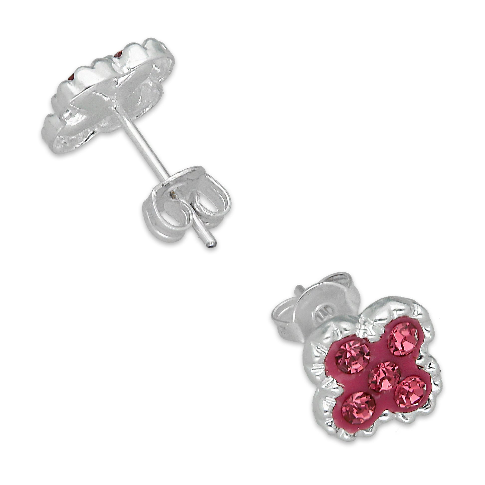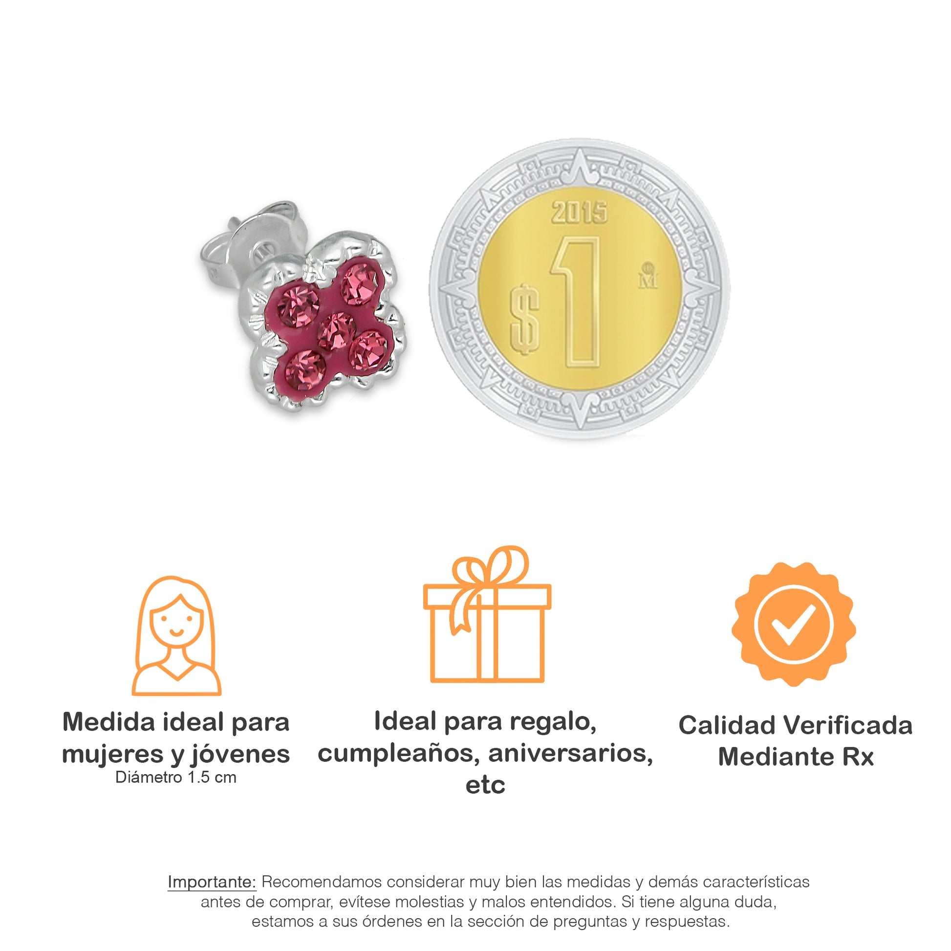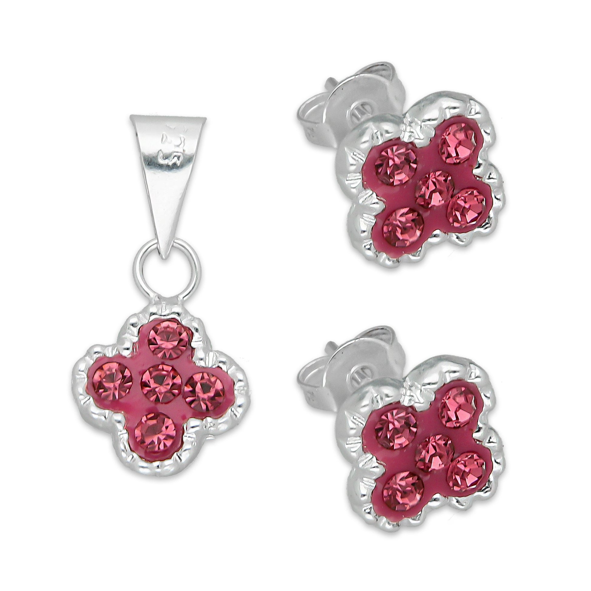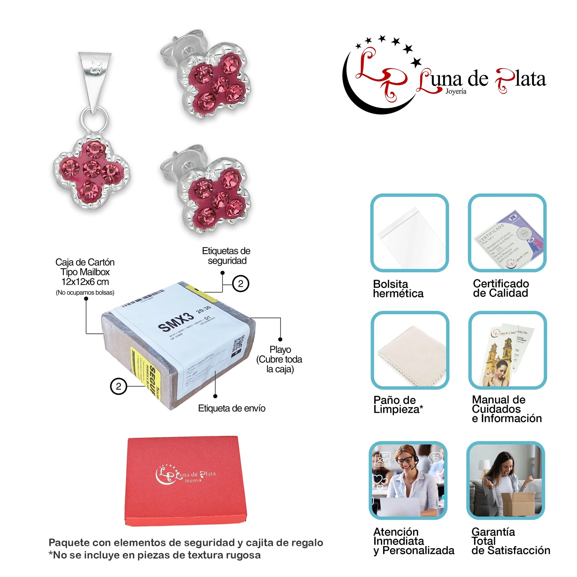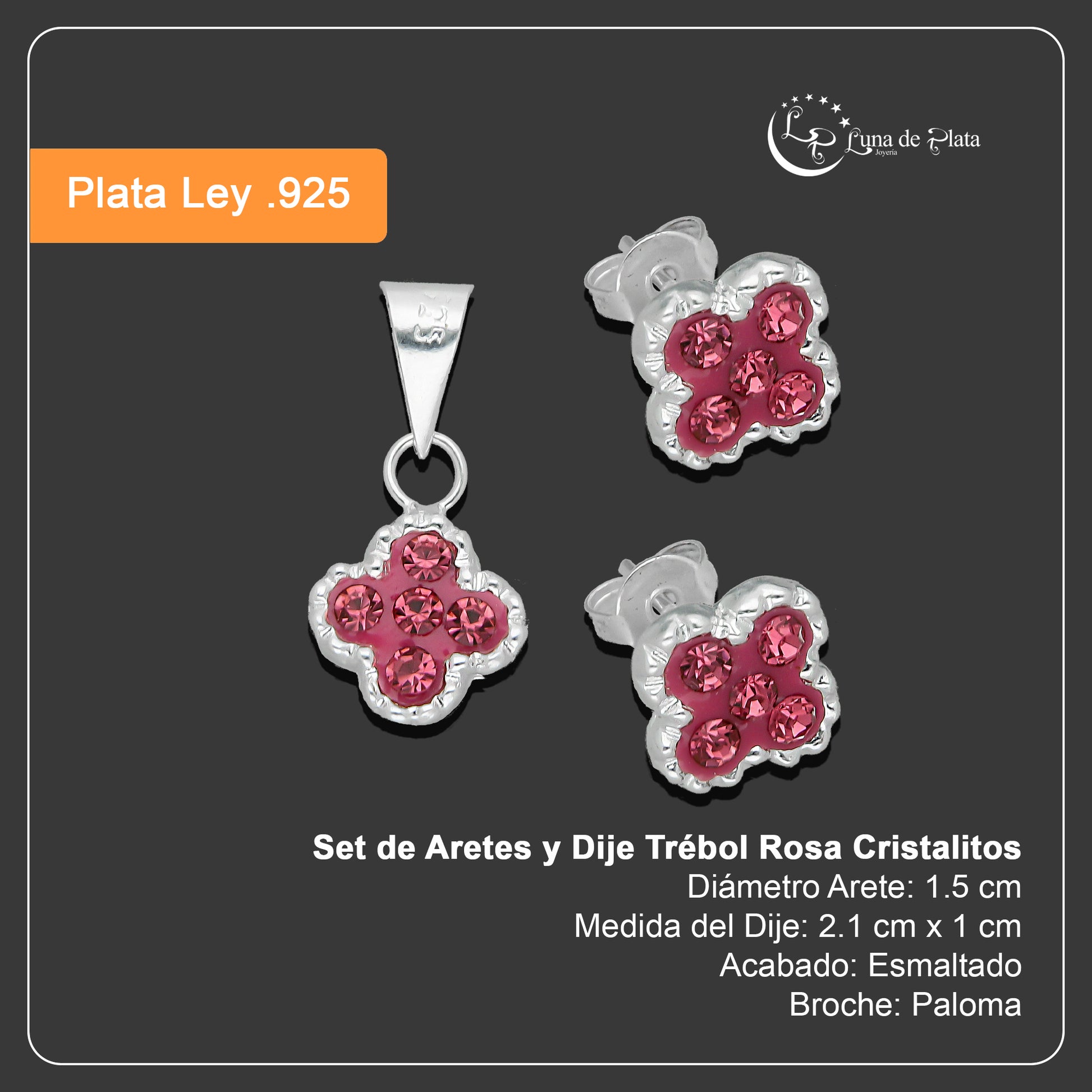 LPADJ076 Set de Aretes y Dije Trébol Rosa Cristalitos Diámetro 2.1 cm en Plata Ley .925