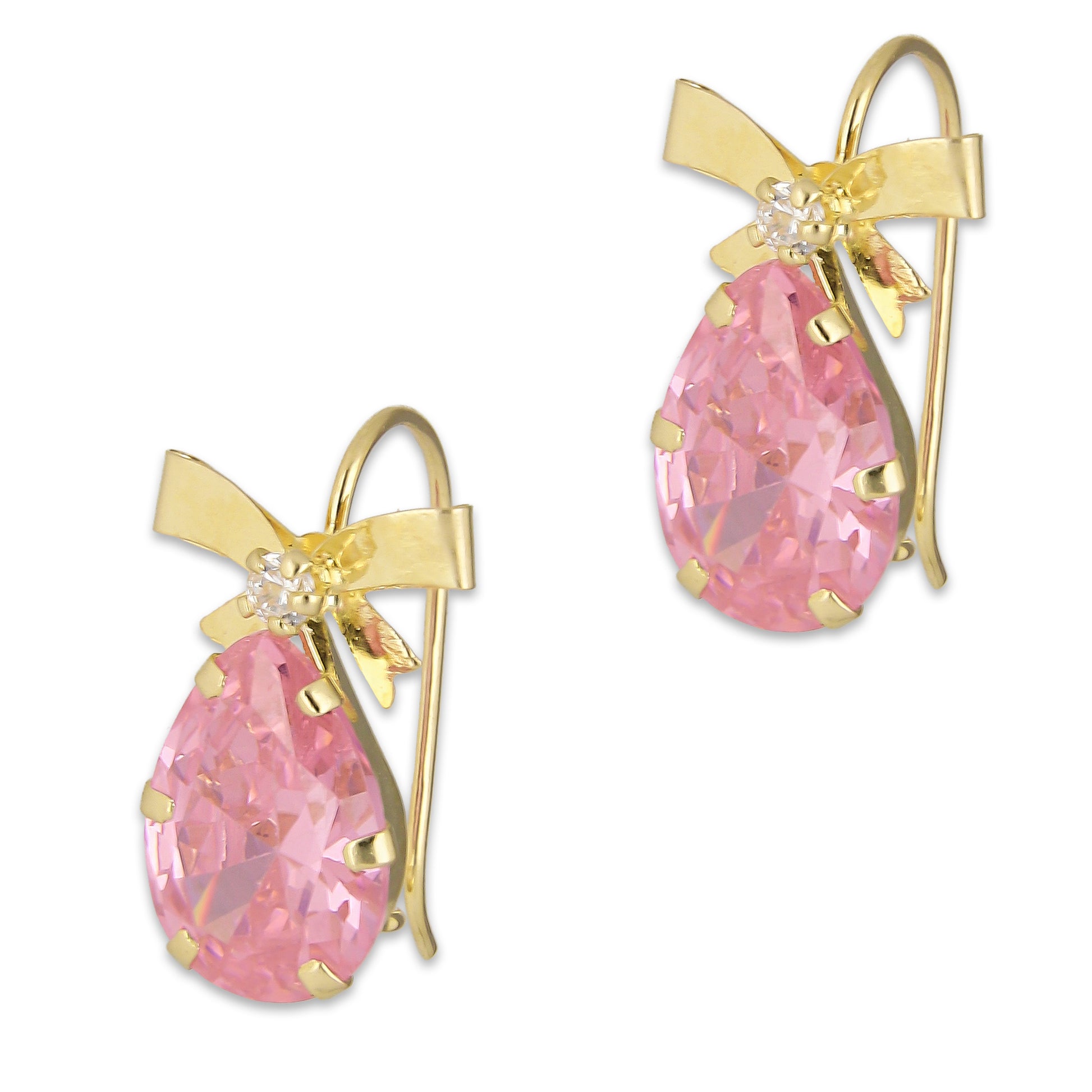LPEAR009 Arete Arillo Oro Sólido 10K Modelo Moñito con Zirconia de Gota Rosa 2531139165