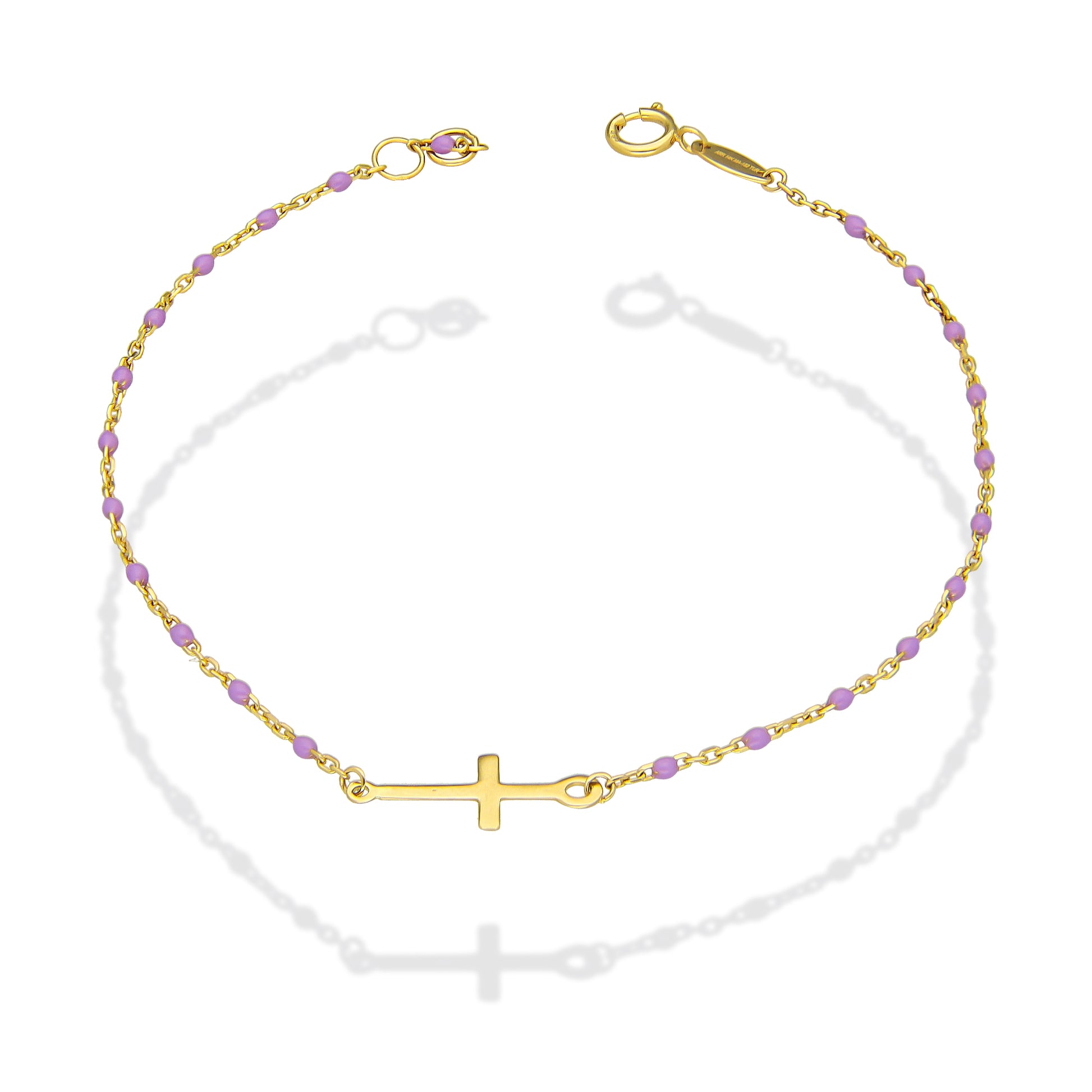 MR14PD140 Pulsera Dama Oro Sólido 14K EMF14 Modelo Bolitas Morado con Cruz Lisa en medio 1 mm x 18 cm