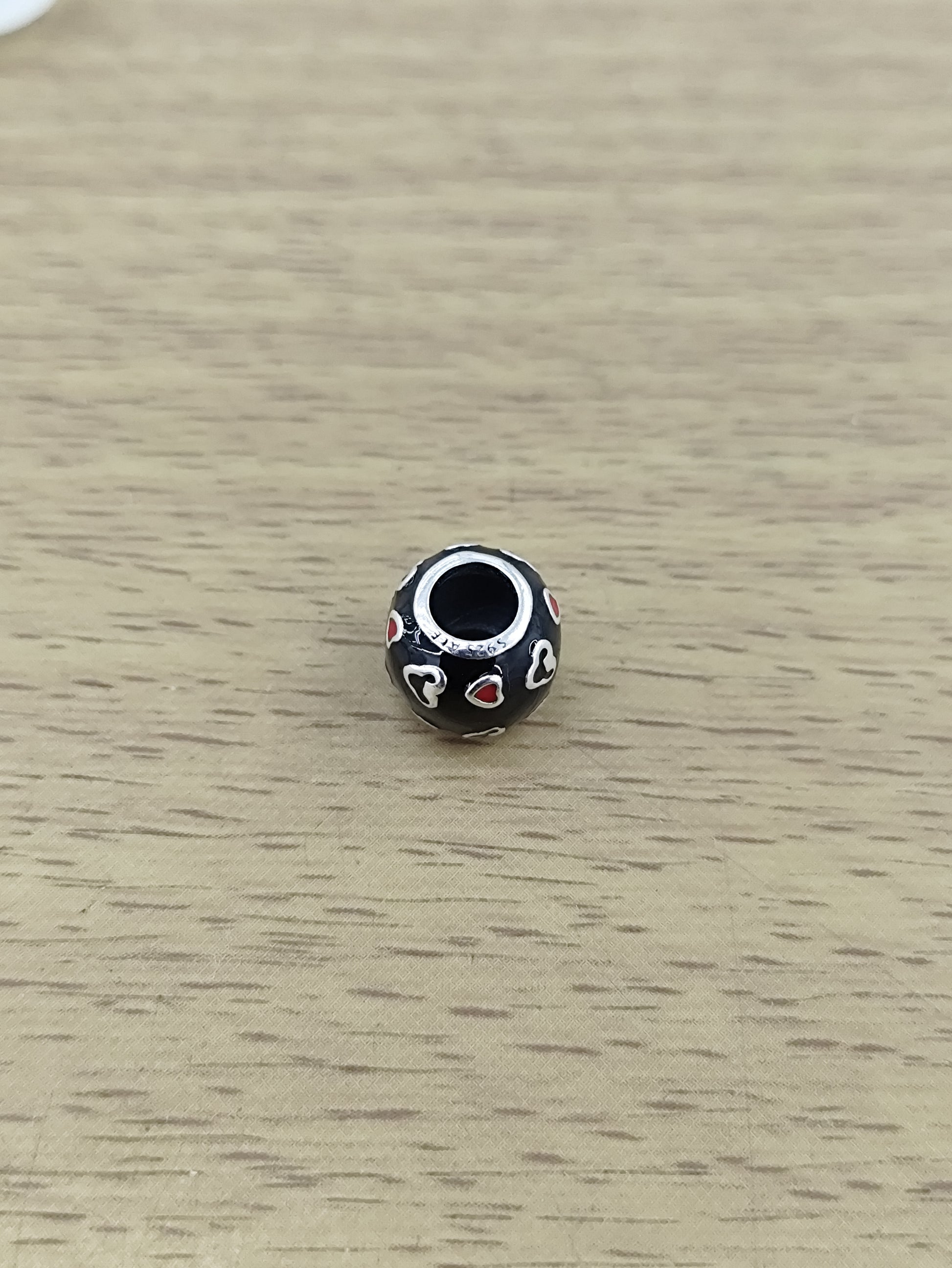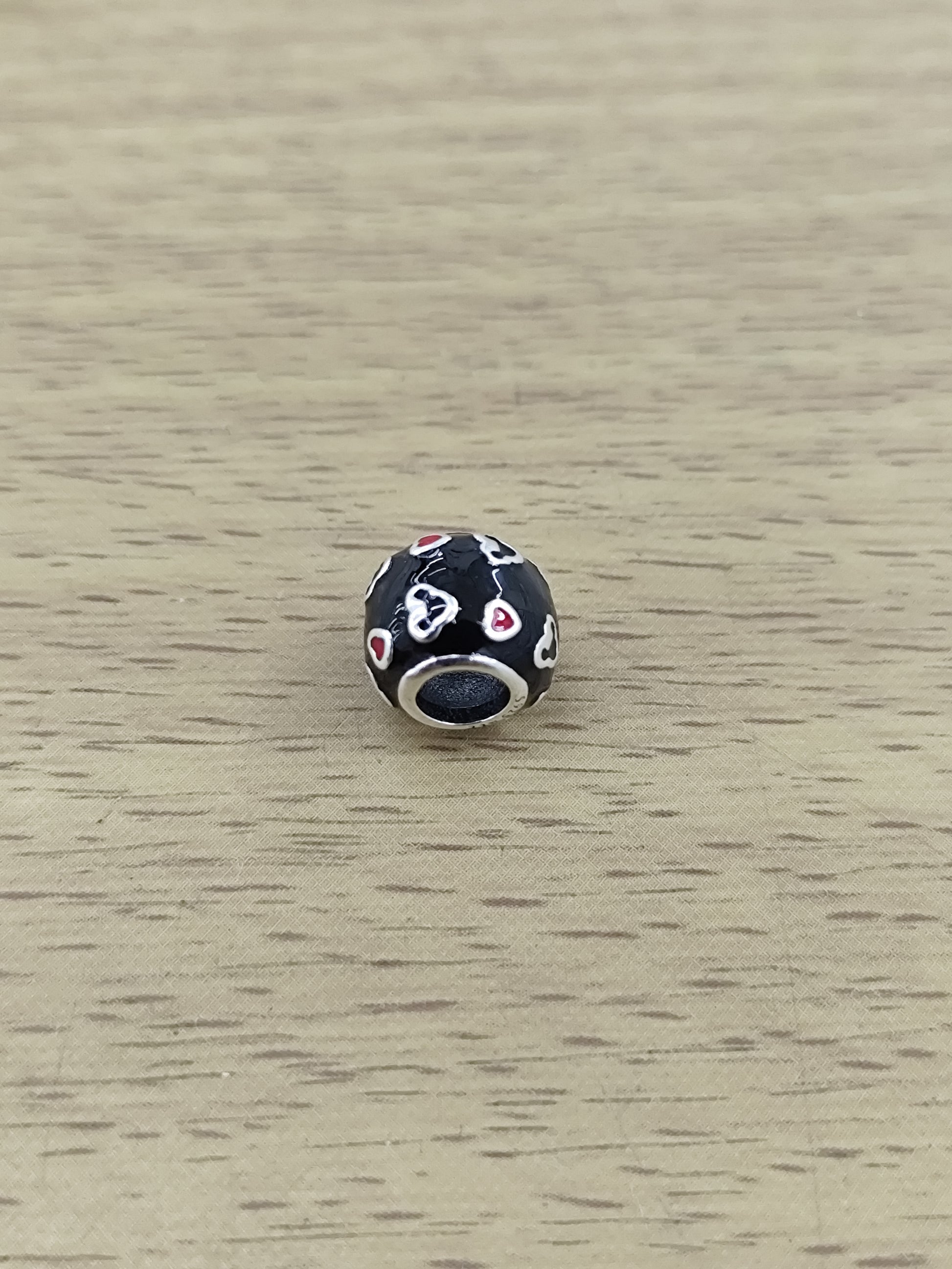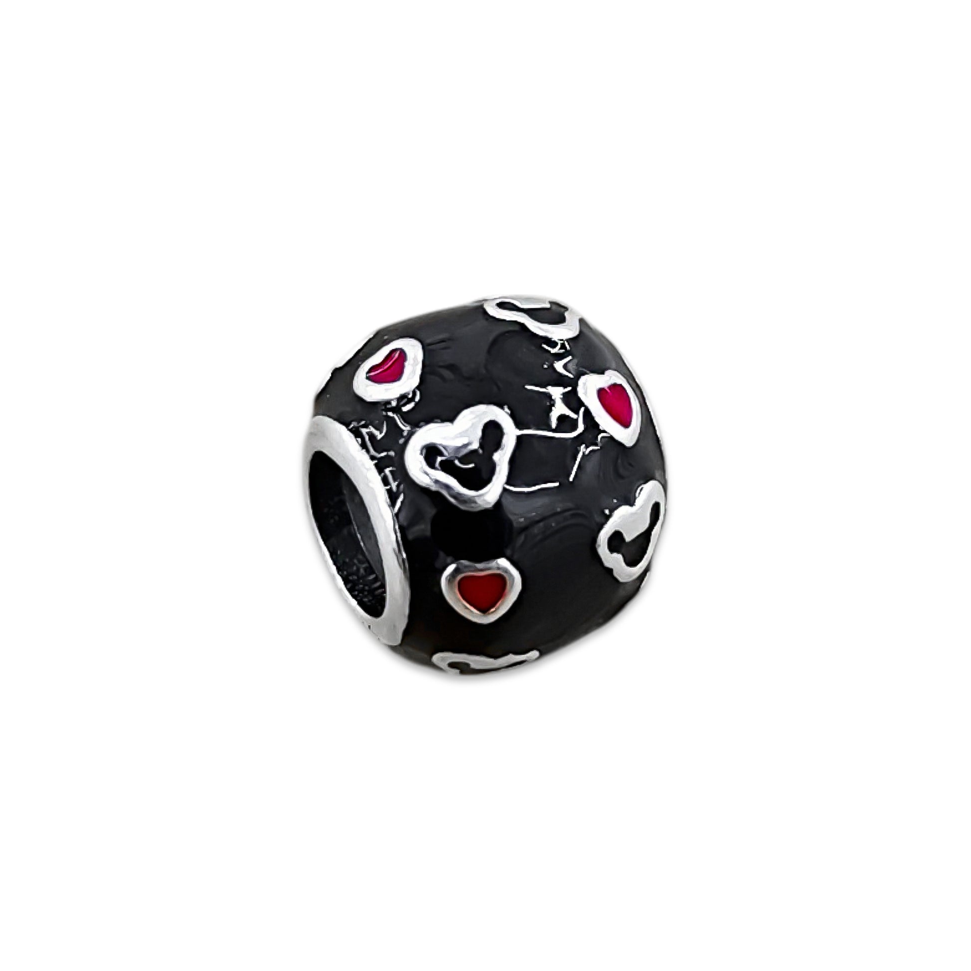 TMPCH033 Dije Charm Pand Bola de Fuego Esmalte Negro con Corazones en Plata Fina .925