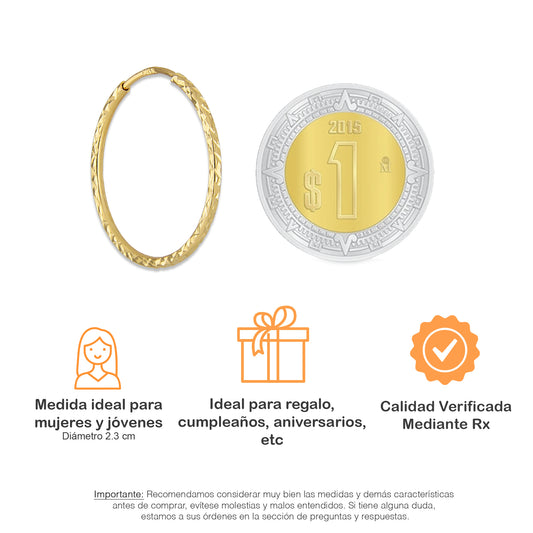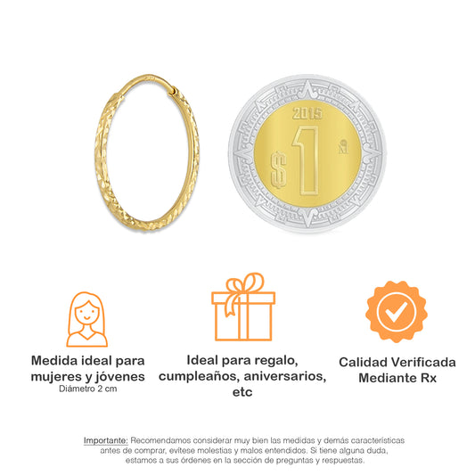 LPEAR020 Arete Arracada de Tubo Diamantada en Oro Sólido 14K 2 cm de Diámetro