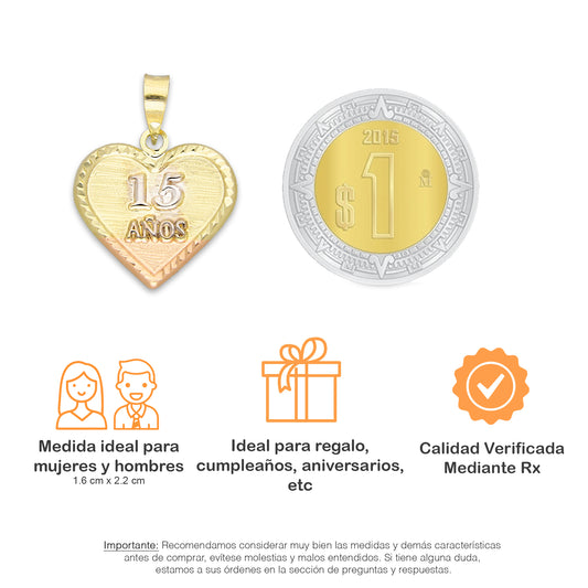 LPEDJ023 Dije Troquelado Oro Sólido 14K Florentino Corazón XV Años 1.6 cm x 2.2 cm